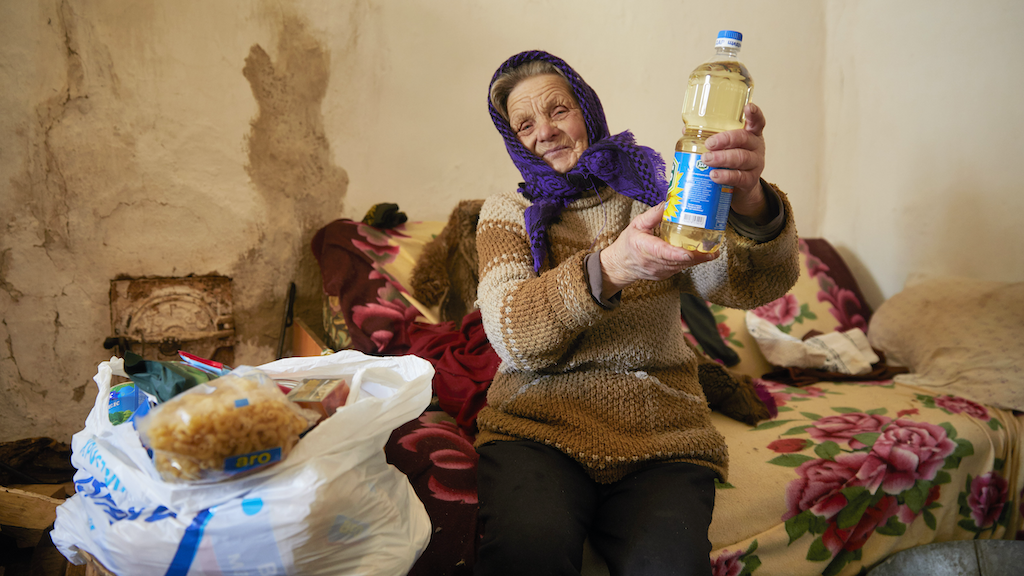 In Ukraine, thousands of Jewish elderly people still live in great poverty in cities and in rural areas. They often live in dreadful conditions, like Masha in the photo. It’s cold in her clay house, but she warmly welcomes us. The food parcels that we bring are desperately needed to get through the winter.